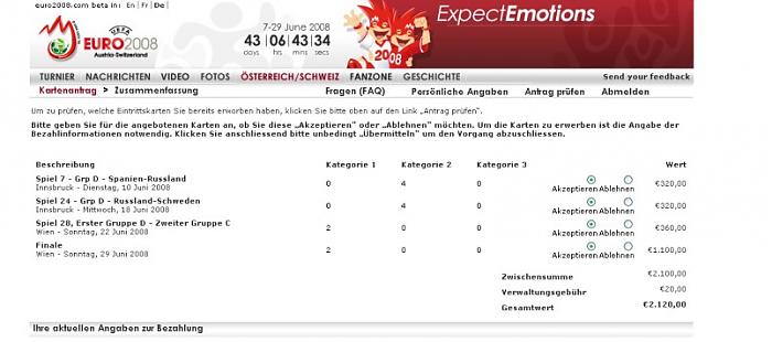 nachdem ich über die Warteliste zweimal Finale Kat. 1 für je 550,-€ zugeteilt bekommen habe, selbst nicht hin will und bisher im Freundeskreis nur eines der Beiden an den Mann gebracht habe, mache ich wahr was ich bereits kurz nach der Zuteilung angedeutet habe: